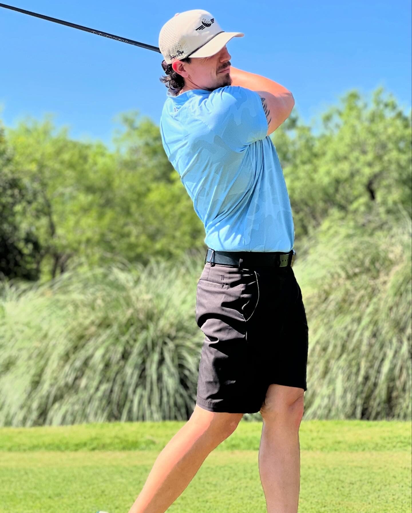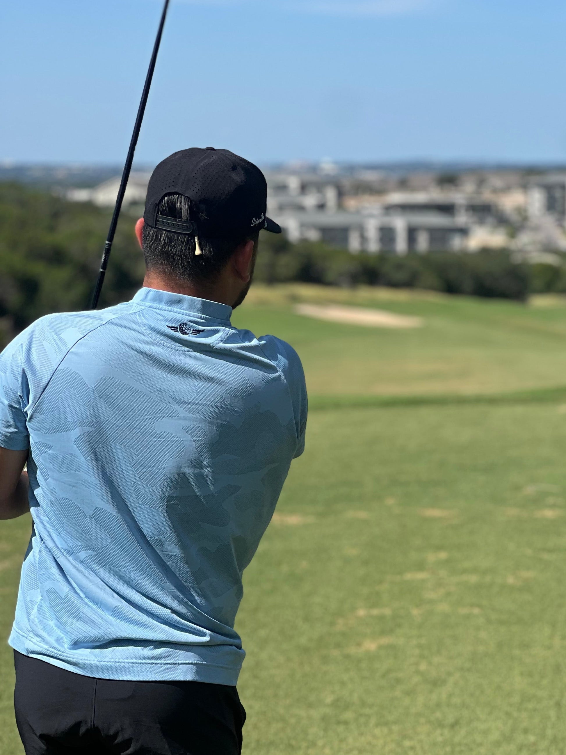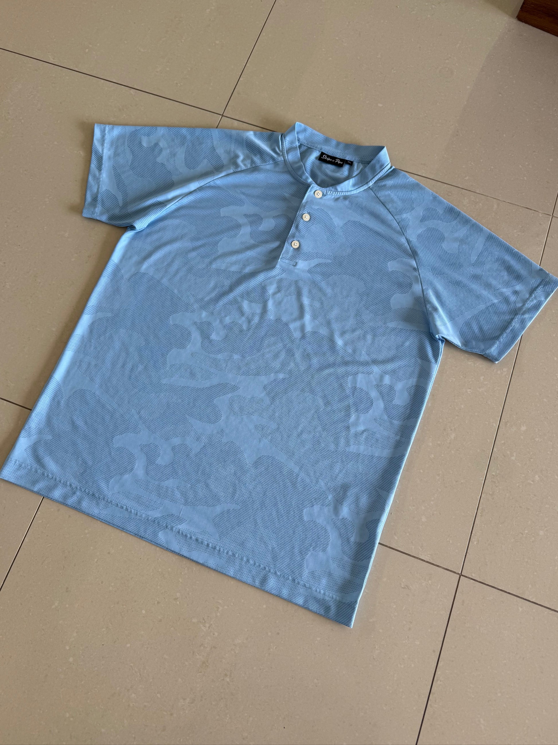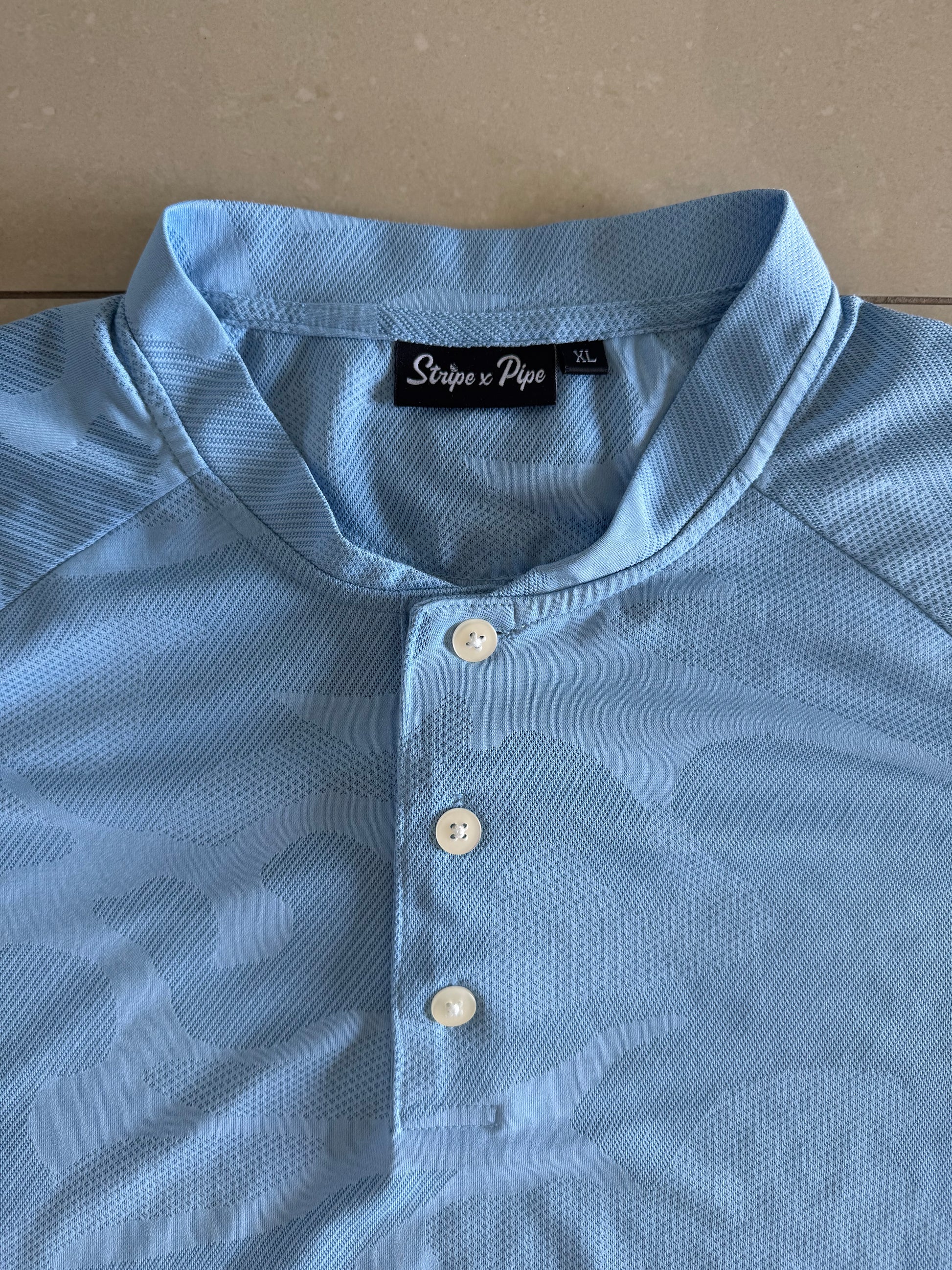 Cool, clean, and built for the fairway. Our Baby Blue Camouflage Blade Collar Shirt features a subtle tonal camo pattern woven into performance fabric that moves with your swing. The modern blade collar and four-button placket bring a sharp, athletic edge