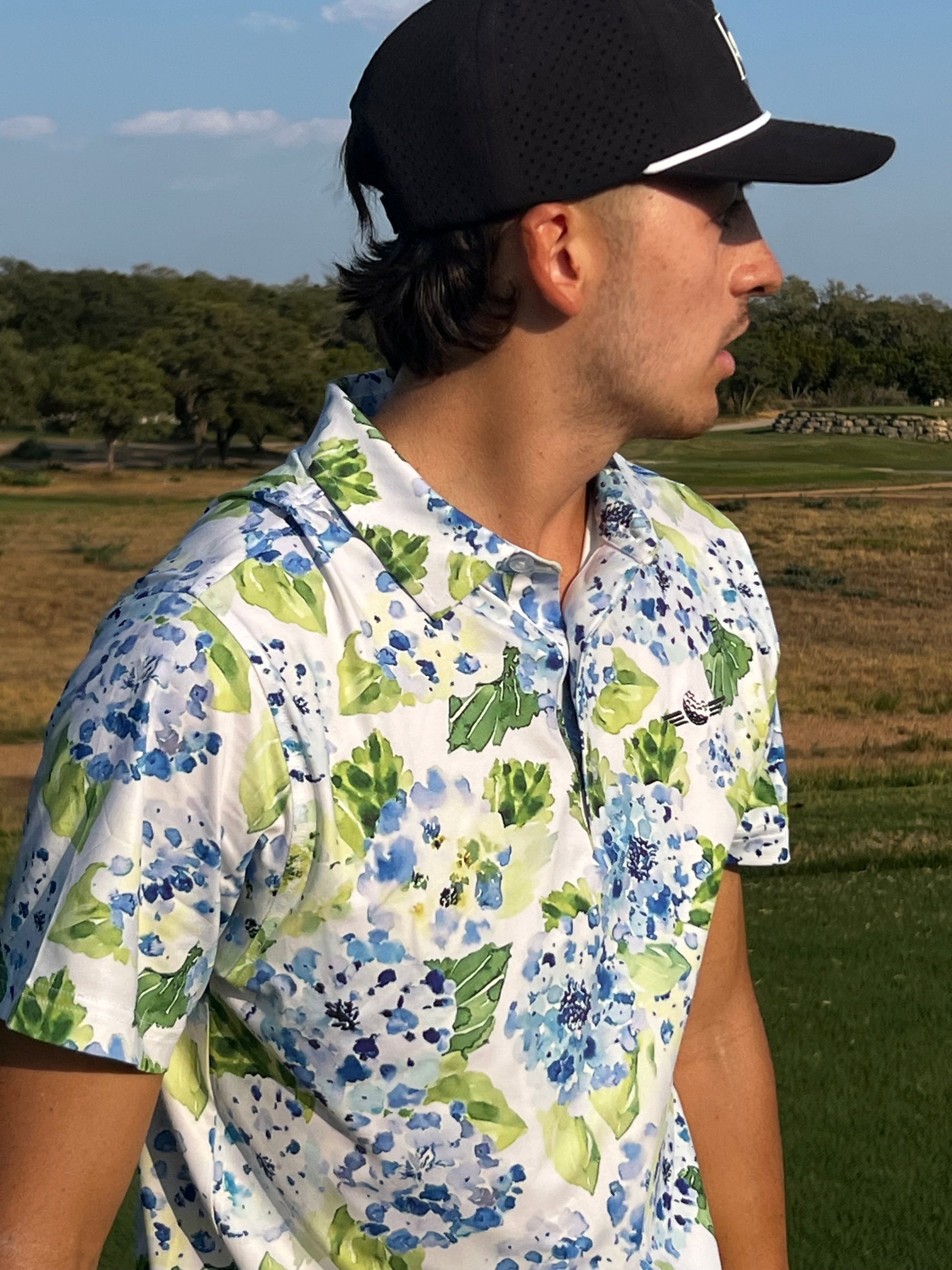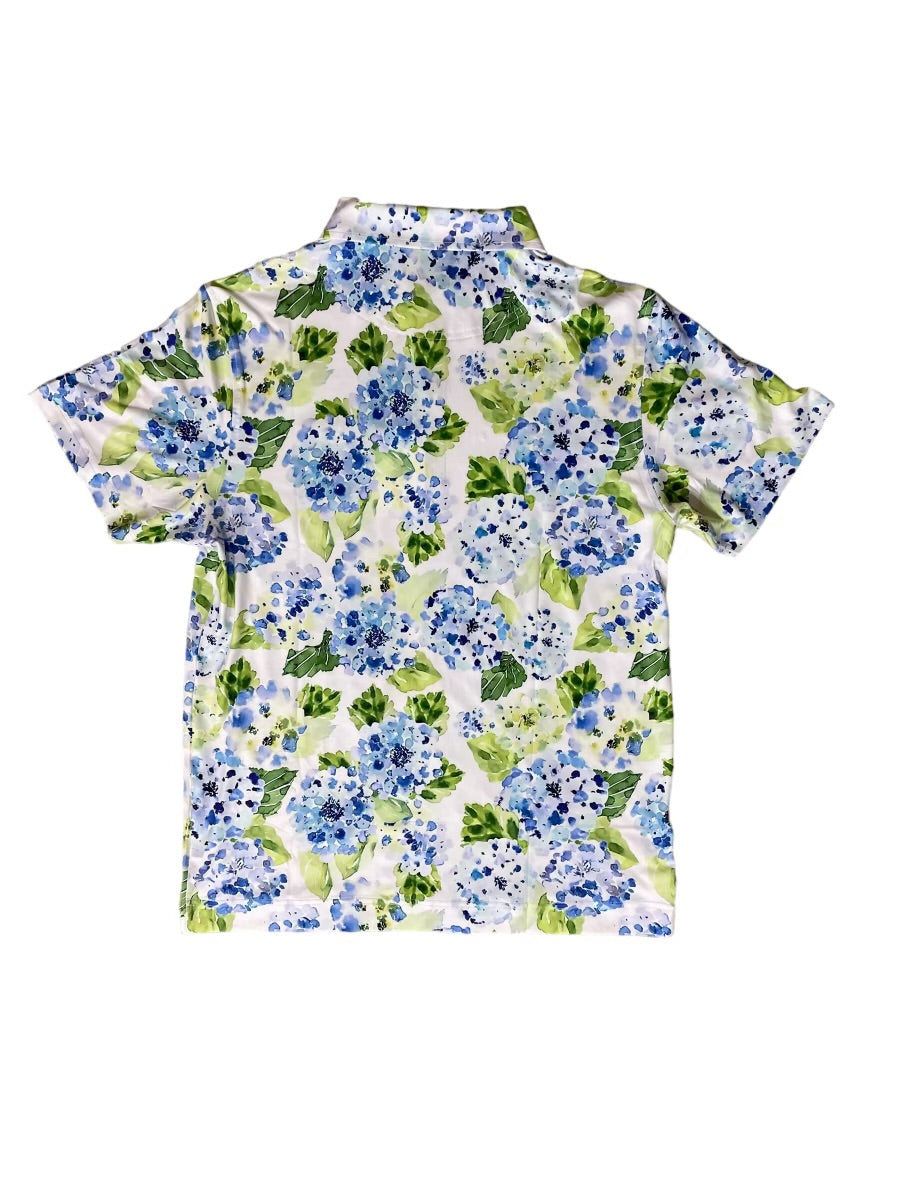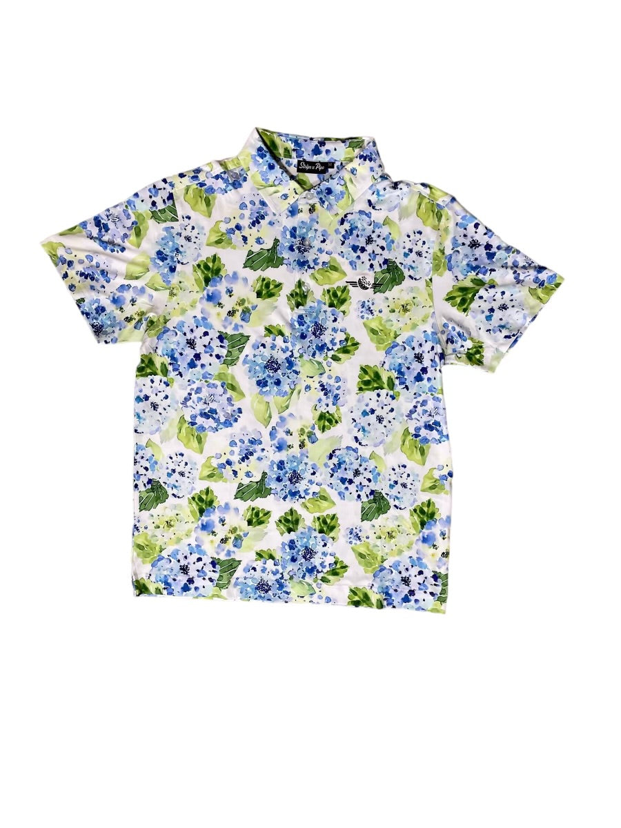 Make every round feel like spring with the Flower Power Polo. Covered in vibrant blue and green hydrangeas, this lightweight, moisture-wicking polo brings fresh energy and all-day comfort to your game. Soft, stretchy, and built to bloom from tee to green.