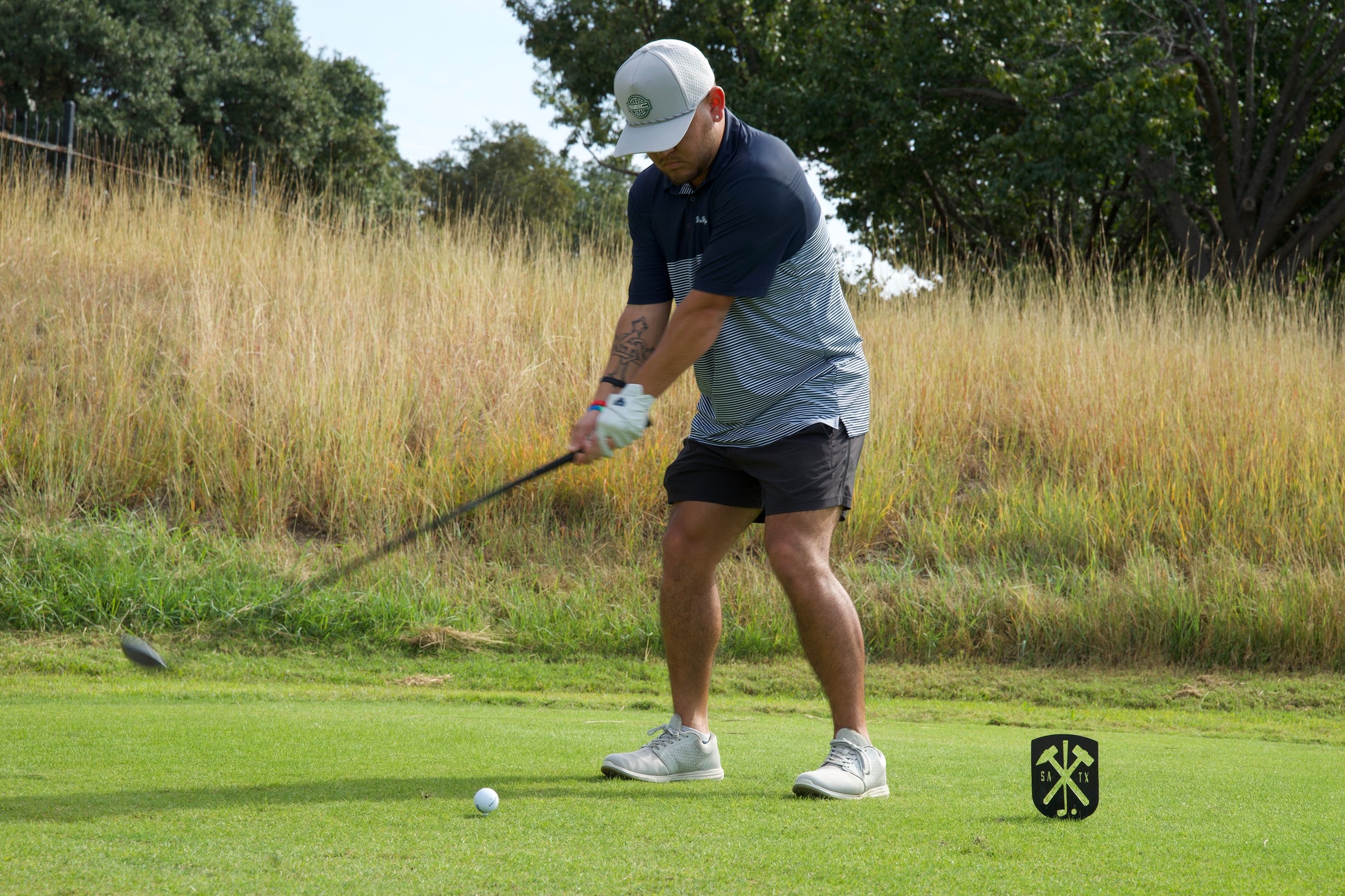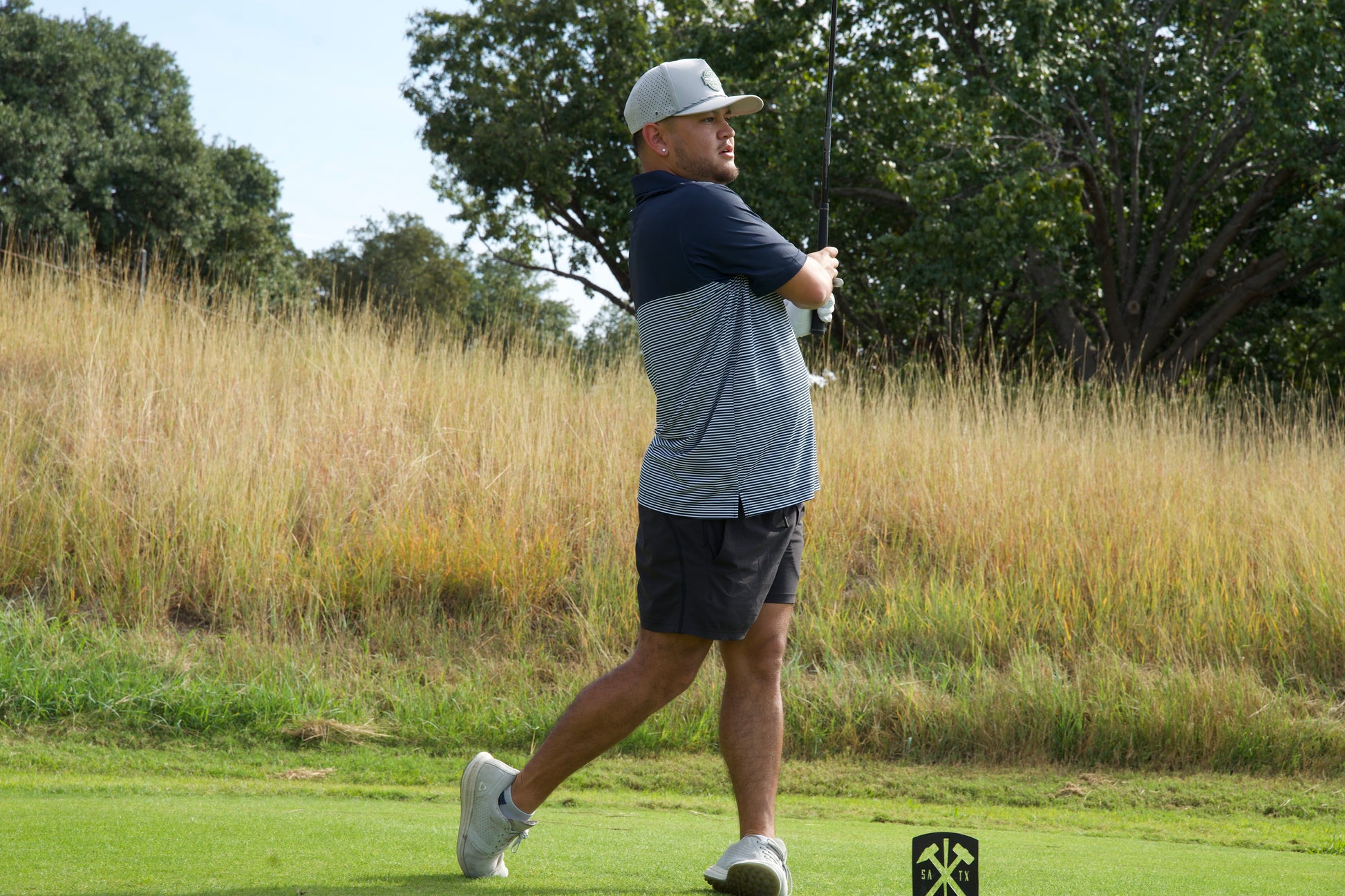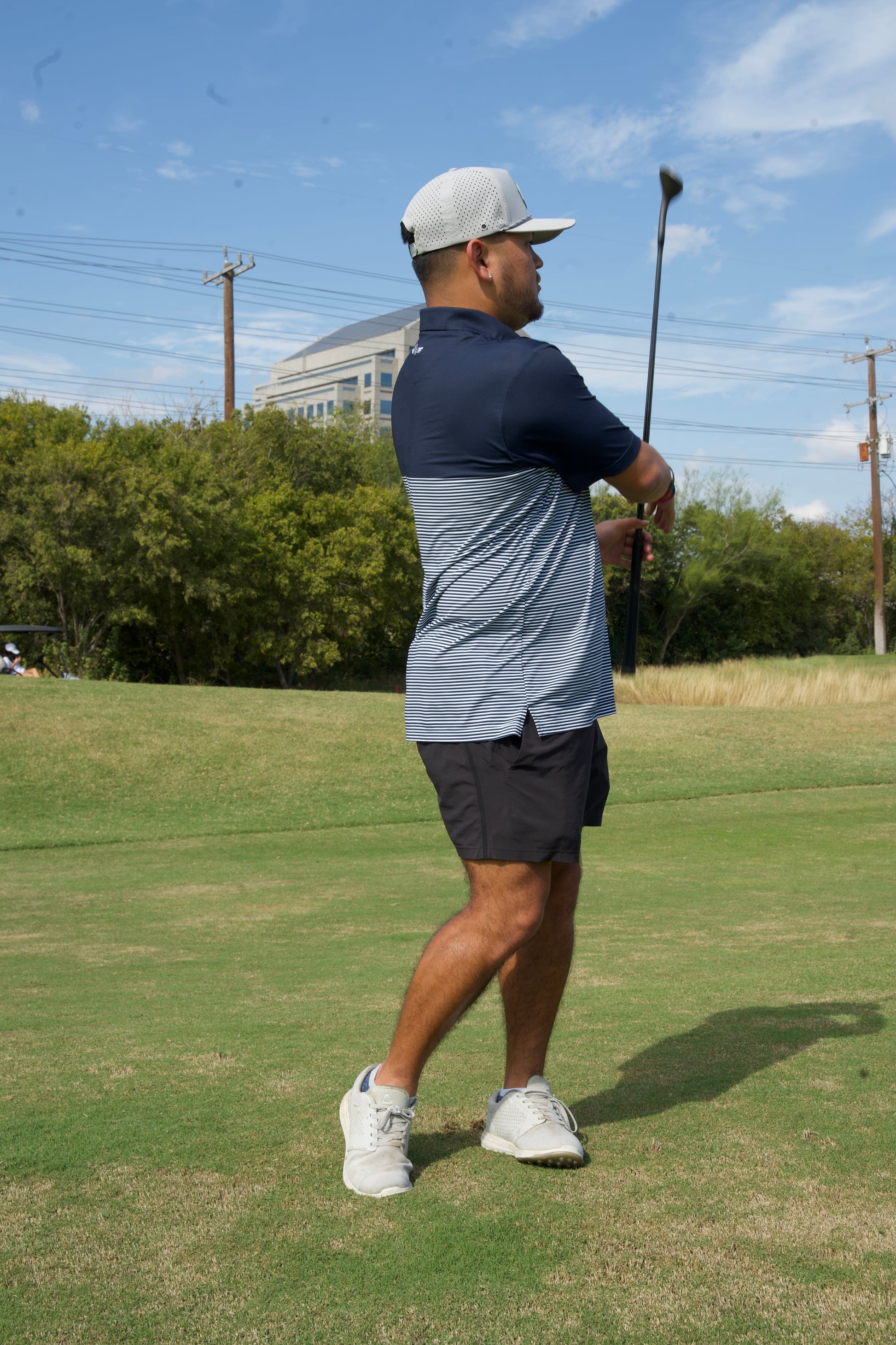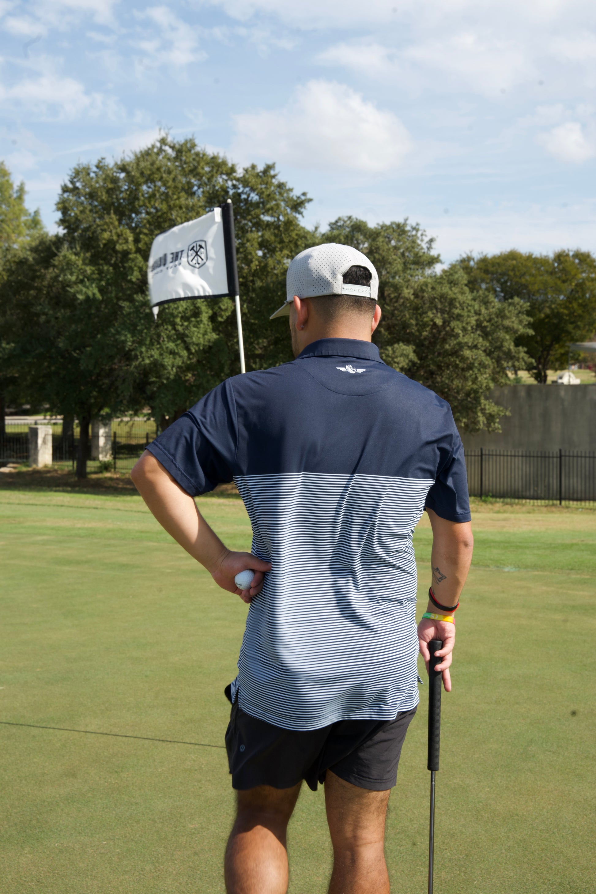 Featuring a bold navy top block with a clean stripe break, this shirt delivers subtle swagger with an old-school edge. It’s designed to move with your swing, built to last, and tailored for players who want to stand out without shouting.