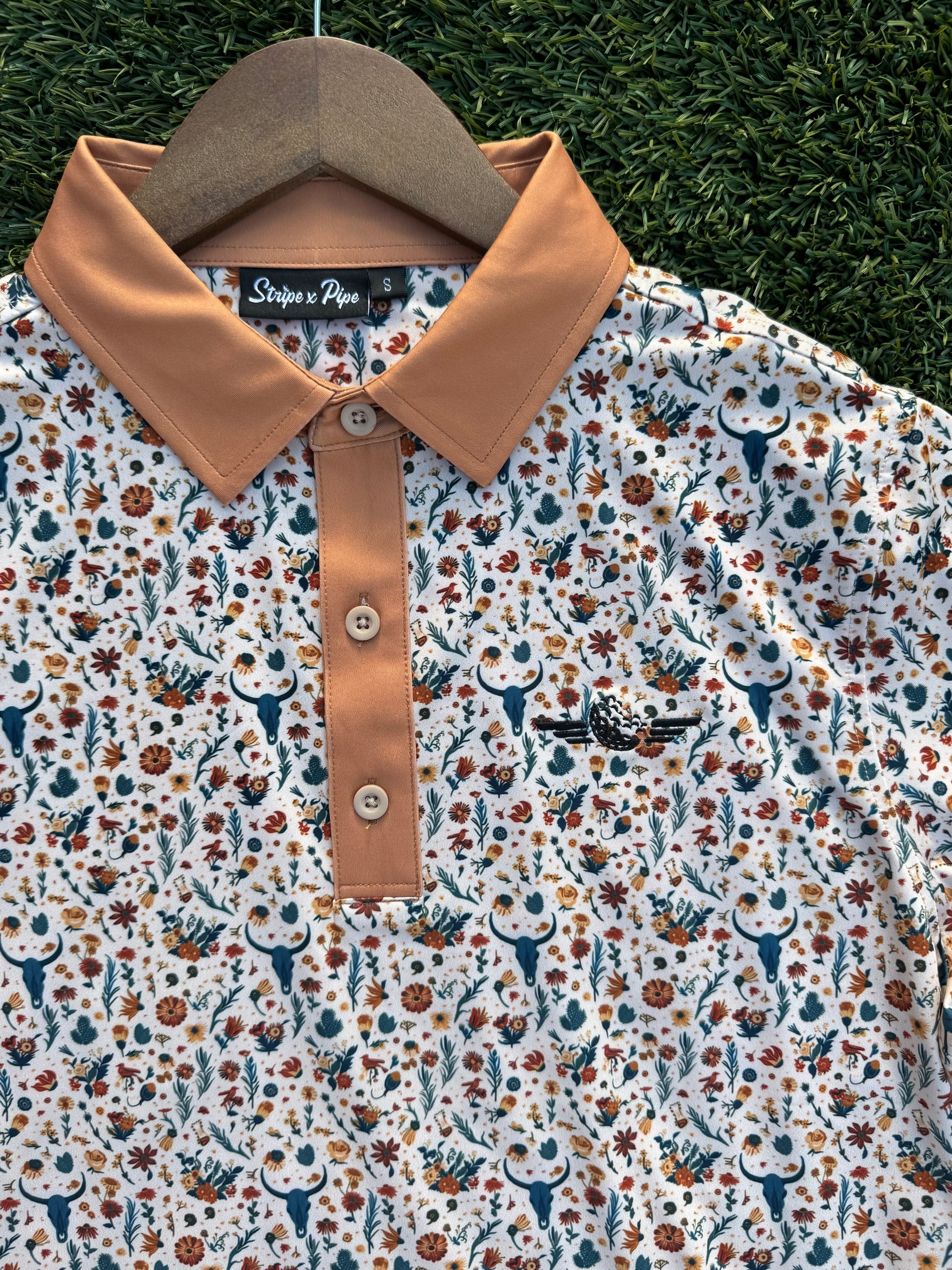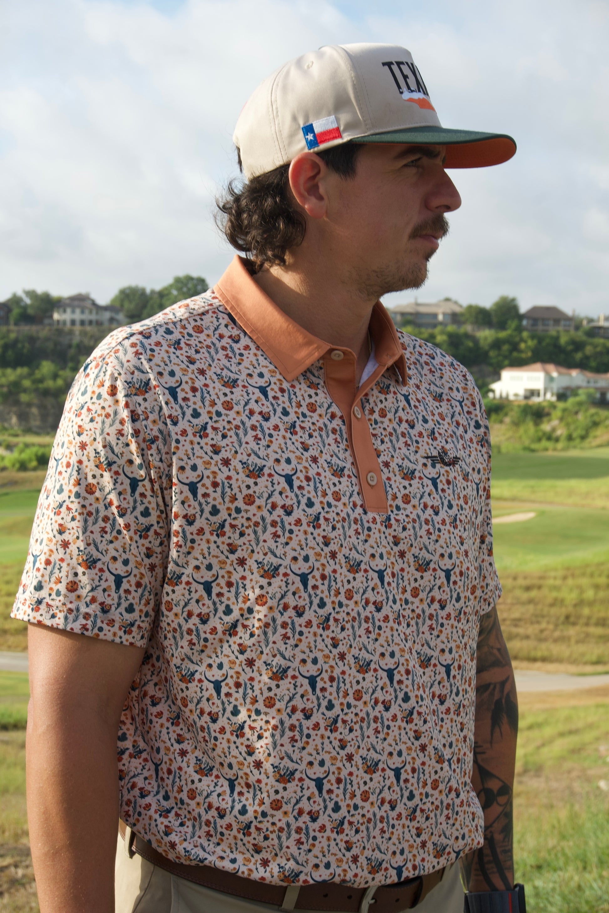 Welcome to the wild side of the fairway. The Howdy Polo features a lively Texas-inspired print filled with desert blooms, cacti, redbirds, longhorn skulls, and nods to Western wildlife — all woven into a crisp performance fabric that feels as good as it looks. With a clay-colored collar and placket for that vintage Western touch, this polo is built for players who ride their own trail, whether it’s a golf cart or a back road.