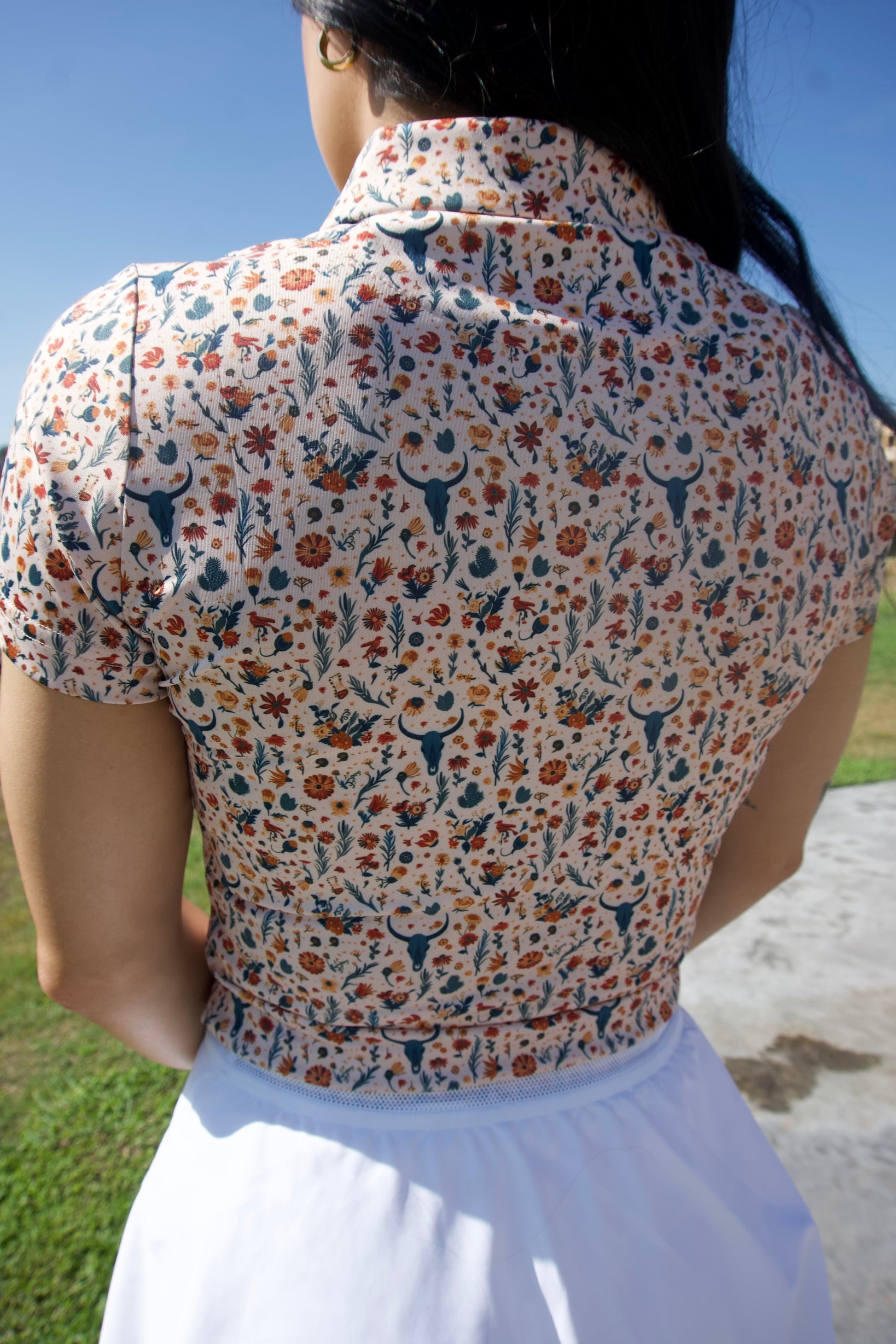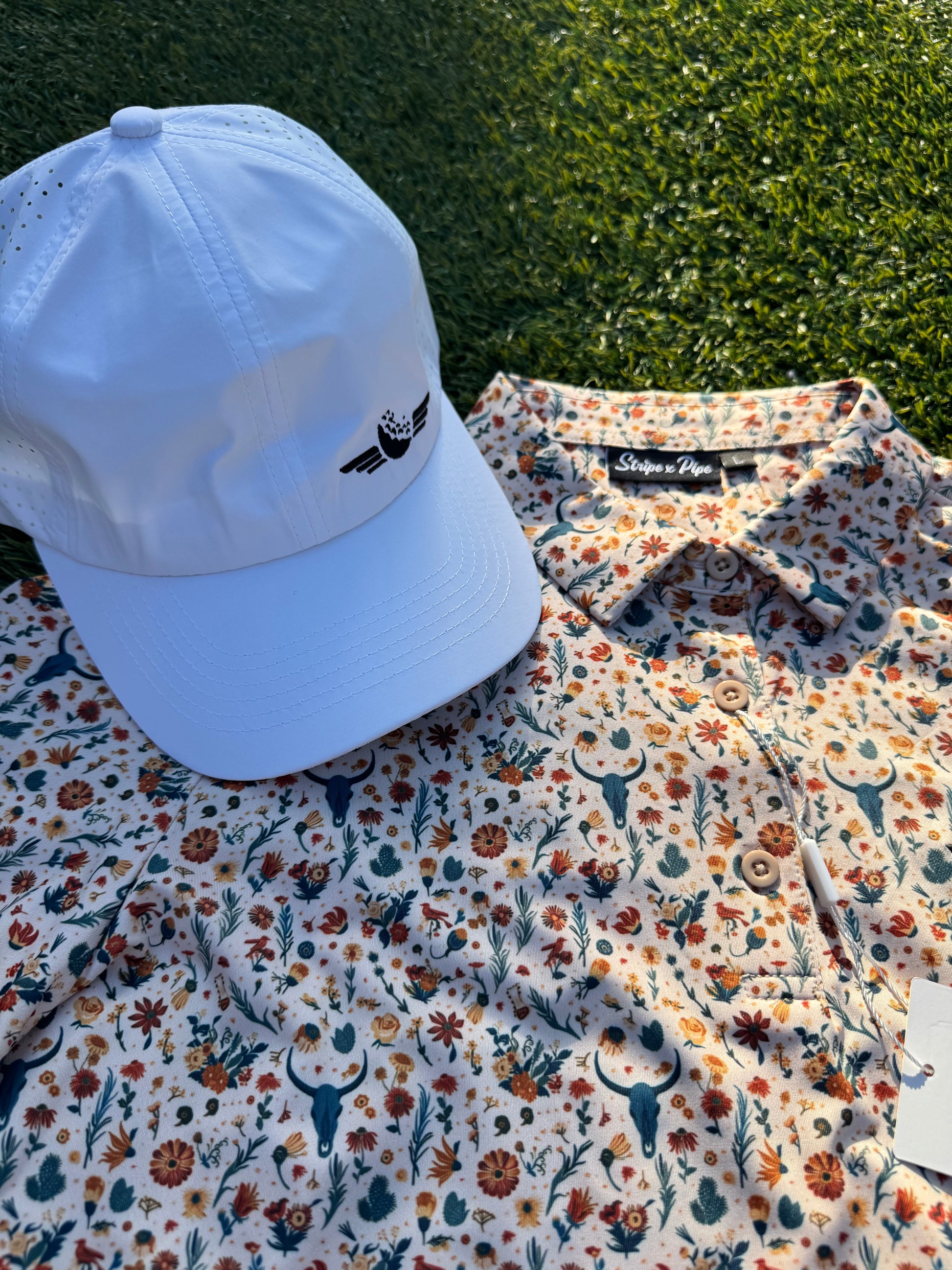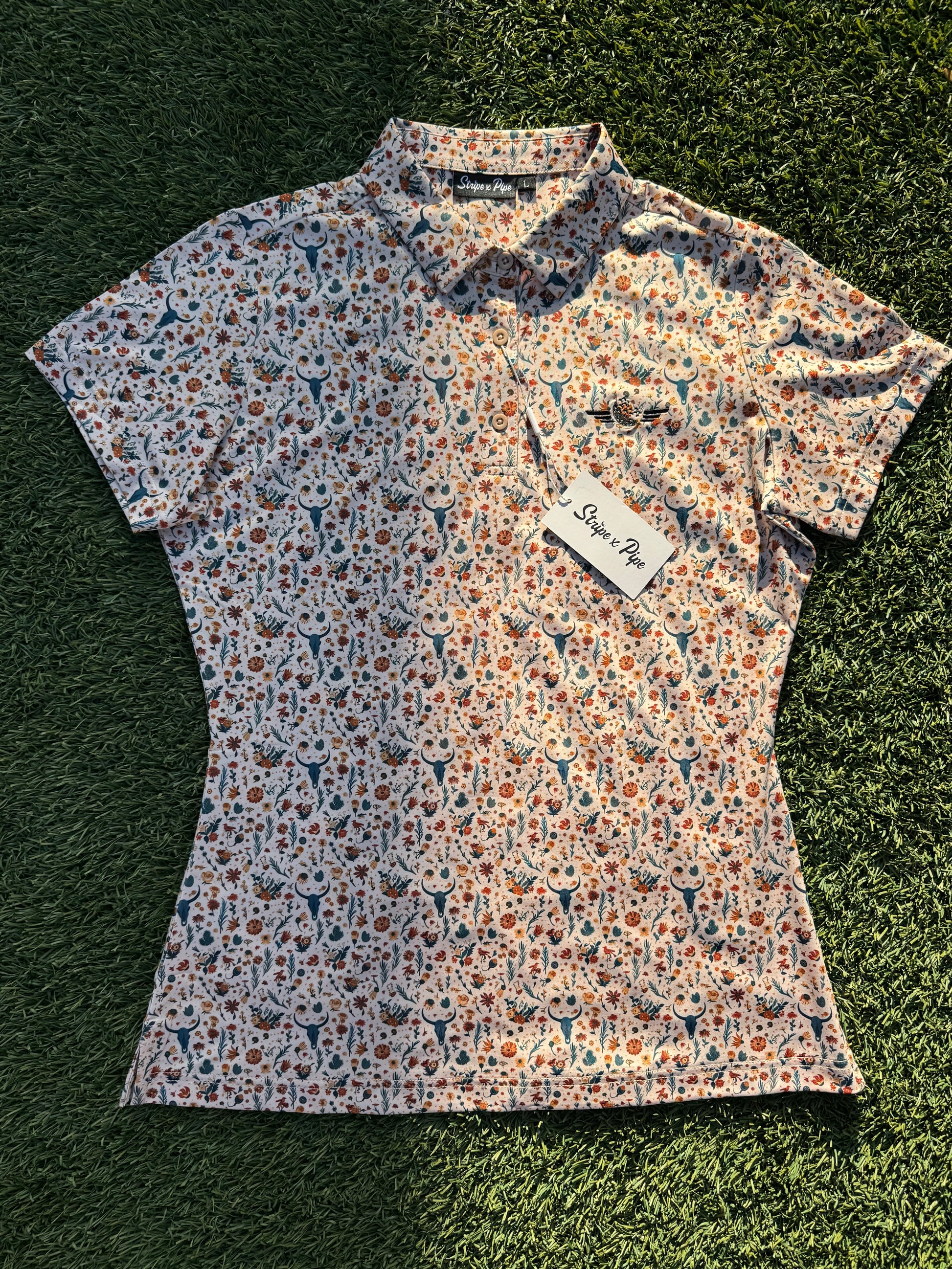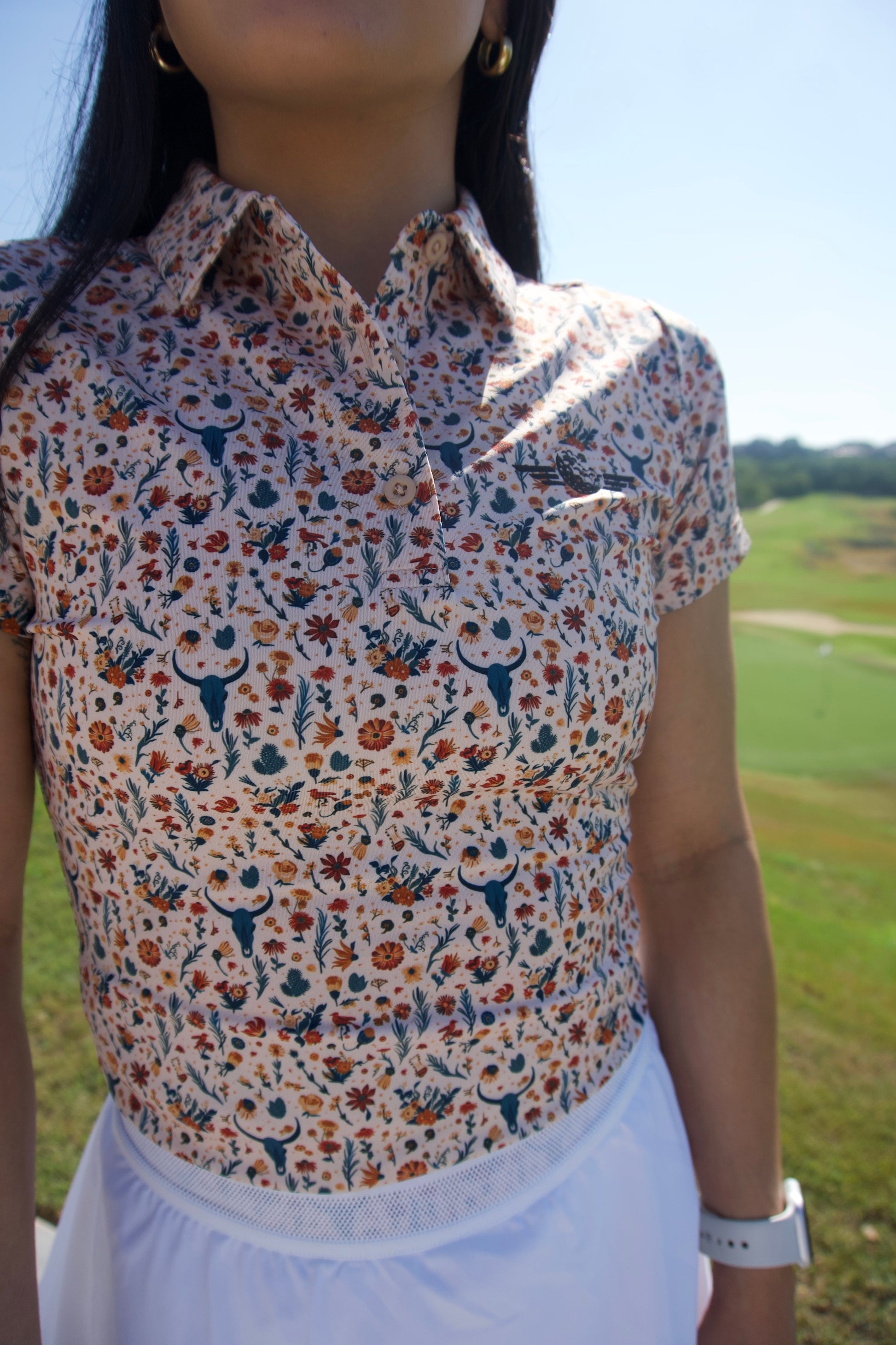 Where wildflowers meet fairways. The Women’s Howdy Polo is a bold blend of desert charm and golf course grace; featuring a Western floral pattern full of blooming Texas wildflowers, prickly pear cacti, redbirds, and longhorn skulls. The sculpted silhouette and structured collar give this polo a flattering, athletic fit that’s built for performance but styled for everywhere.